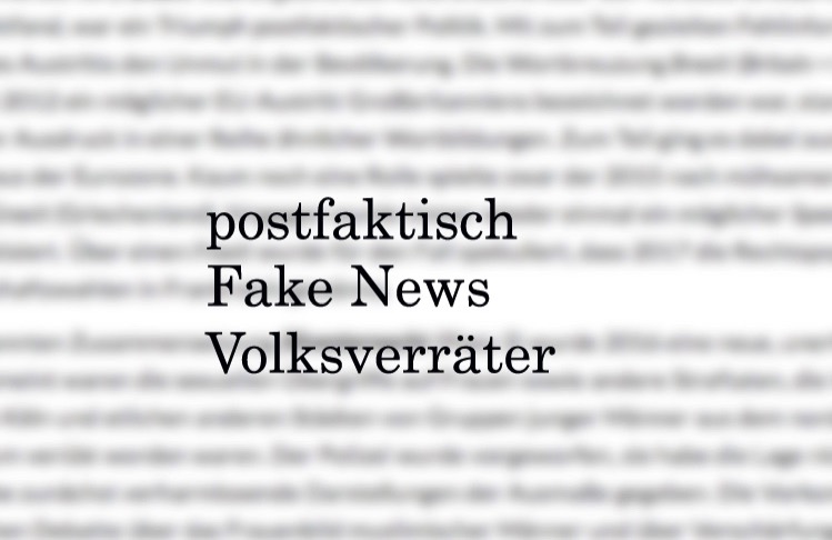 Bereits 2014 war das Wort Lügenpresse, mit dem antidemokratische Kräfte die freie, öffentliche Presse zu diffamieren versuchen, zum Unwort gewählt worden. Mit diesem Wort werden recherchierte Sachverhalte oder auch der demokratische Diskurs als Ganzes der Unwahrheit bezichtigt – es steht insoweit für das Verleugnen der Wahrheit und der Hinwendung zum Postfaktischen. Womit die Verbindung zu einem ebenfalls prämierten Begriff hergestellt werden kann: postfaktisch ist das „Wort des Jahres 2016“, das im Dezember von der „Gesellschaft für deutsche Sprache“ in Wiesbaden prämiert wurde. Im „Digitalen Wörterbuch der deutschen Sprache“ (www.dwds.de) wird die Bedeutung von postfaktisch so beschrieben: „anerkannte Tatsachen, als gesichert geltendes Wissen nicht zur Kenntnis nehmend und sich stattdessen auf subjektive Wahrnehmungen und ungeprüfte Behauptungen stützend bzw. sich auf Stimmungen und Gefühle beziehend“.